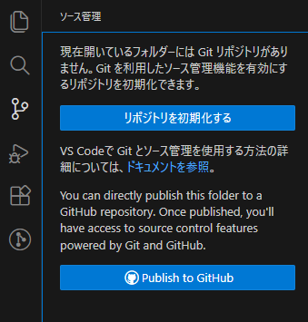 左メニューの「ソース管理」で「リポジトリを初期化する」をクリックし、リポジトリの初期化処理。