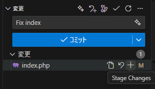 ソース管理の変更欄に変更があったファイルが表示されるので、「+」ボタンを押してコミットの対象に追加