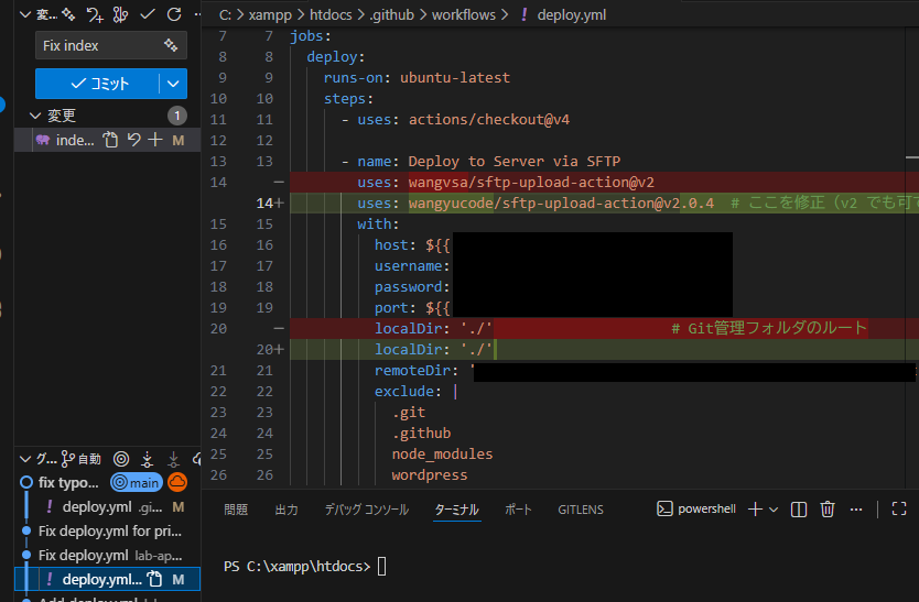ローカル側とGitHub側の設定が出来たら、ローカル側にて