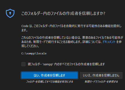 VSCodeでフォルダを開こうとすると、以下の様なメッセージが表示されるので