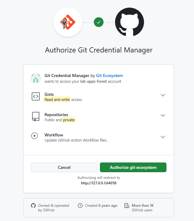 「Authorize git-ecosystem」ボタンを押して認証すれば、GitHubのリポジトリにPushすることが