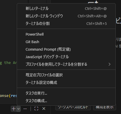ターミナルの+ボタンの横にある下矢印からメニューを開いて、「既定プロファイルの選択」