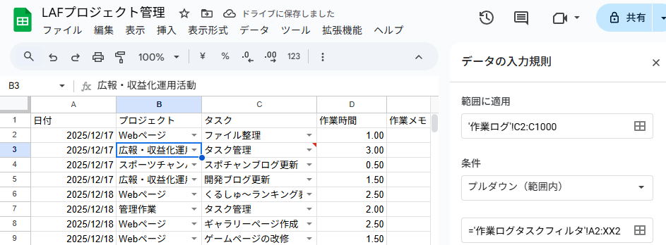 そして、あとは作業ログのタスク欄に、ワーク用のシートを対象行を条件にしたデータの入力規則を追加すれば、プロジェクトに紐づくタスクのみが選択可能になります。