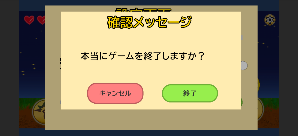 ゲームを終了ボタンを間違って押してしまった場合を考慮して、確認ダイアログを表示するようにしました。