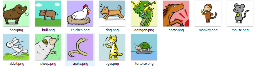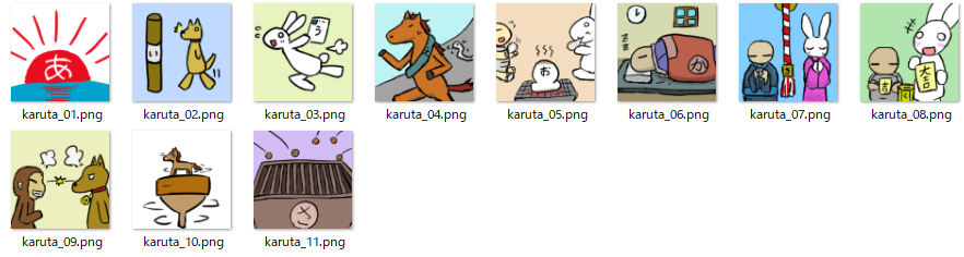 動物イラスト13枚、お正月っぽいカルタ11枚作成しました。