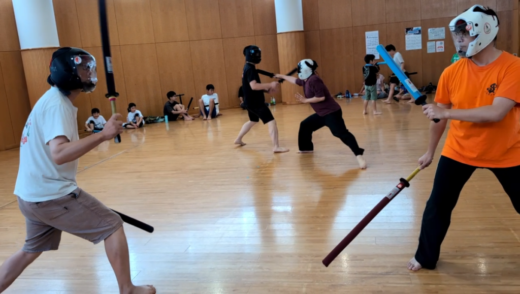 スポーツチャンバラは元々が護身道なため、まずは受けや避けなど、防御の練習を行います。