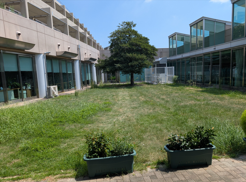 東山公民館の中庭の様子。当日はたぶん草が刈られていると思います。